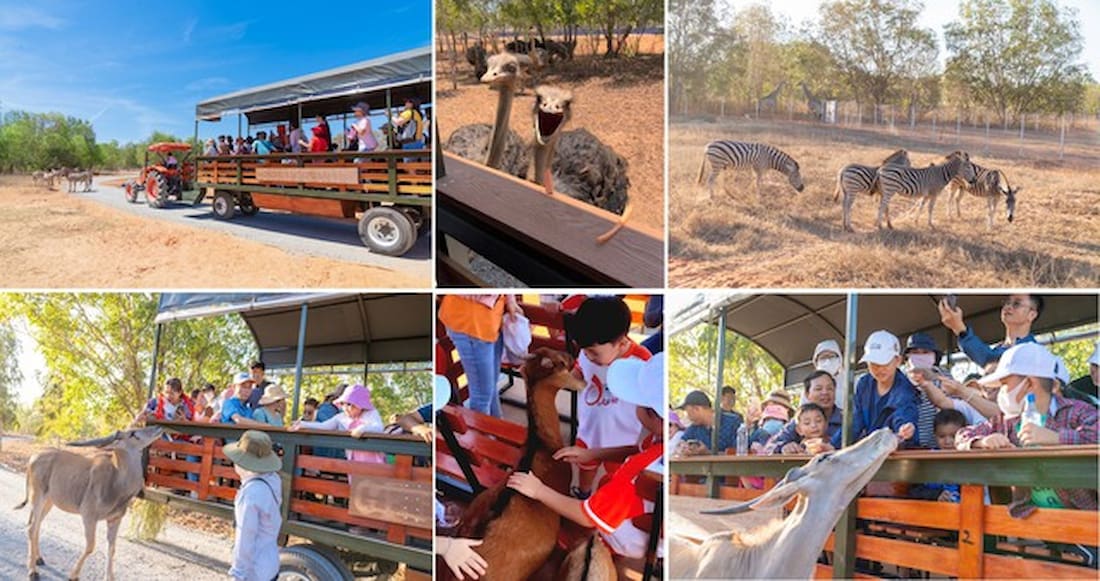 - Du khách mọi lứa tuổi có thể chọn tour máy kéo để khám phá môi trường sống của các loài động vật ăn cỏ như hươu cao cổ, ngựa vằn, bò sừng dài, linh dương Đông Phi, hươu, đà điểu, cừu… Safari Café gần gũi với thiên nhiên được nhiều du khách yêu thích, đặc biệt là trẻ em.