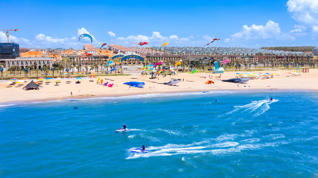 - Novaworld phan thiết sở hữu công viên – Quảng trường Bikini Beach với 7km bờ biển. Ngoài việc tham gia Aquaman Việt Nam, du khách còn được trải nghiệm lướt ván diều, jetski, bóng chuyền bãi biển… hoặc các hoạt động xây dựng đội nhóm dành cho khách đông người.
